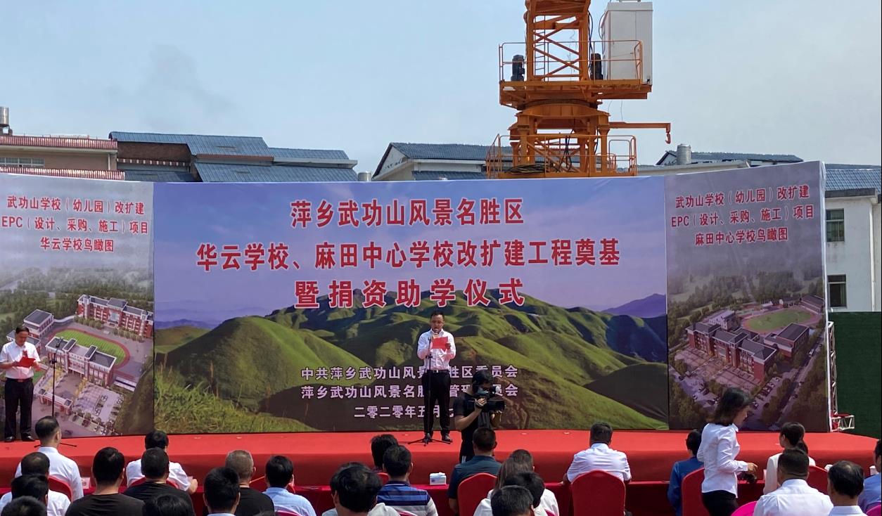 為凝聚各方力量,匯聚各方愛心,加快推進武功山教育事業(yè)發(fā)展,日前,萍鄉(xiāng)武功山學校改擴建工程奠基暨捐資助學儀式在華云學校舉行。市委常委、宣傳部長聶曉葵,市教育局黨委委員、總督學肖國華,廣東鴻發(fā)集團公司董事長助理麥子俊先生等代表,萍鄉(xiāng)第五建筑工程責任有限公司武功山公司總經理劉楊華先生,區(qū)黨委書記李水清、區(qū)黨委副書記陳瓊、區(qū)黨委委員管委會副主任陳芬、景國成等出席了儀式,區(qū)黨委副書記管委會主任鐘偉主持了儀式。