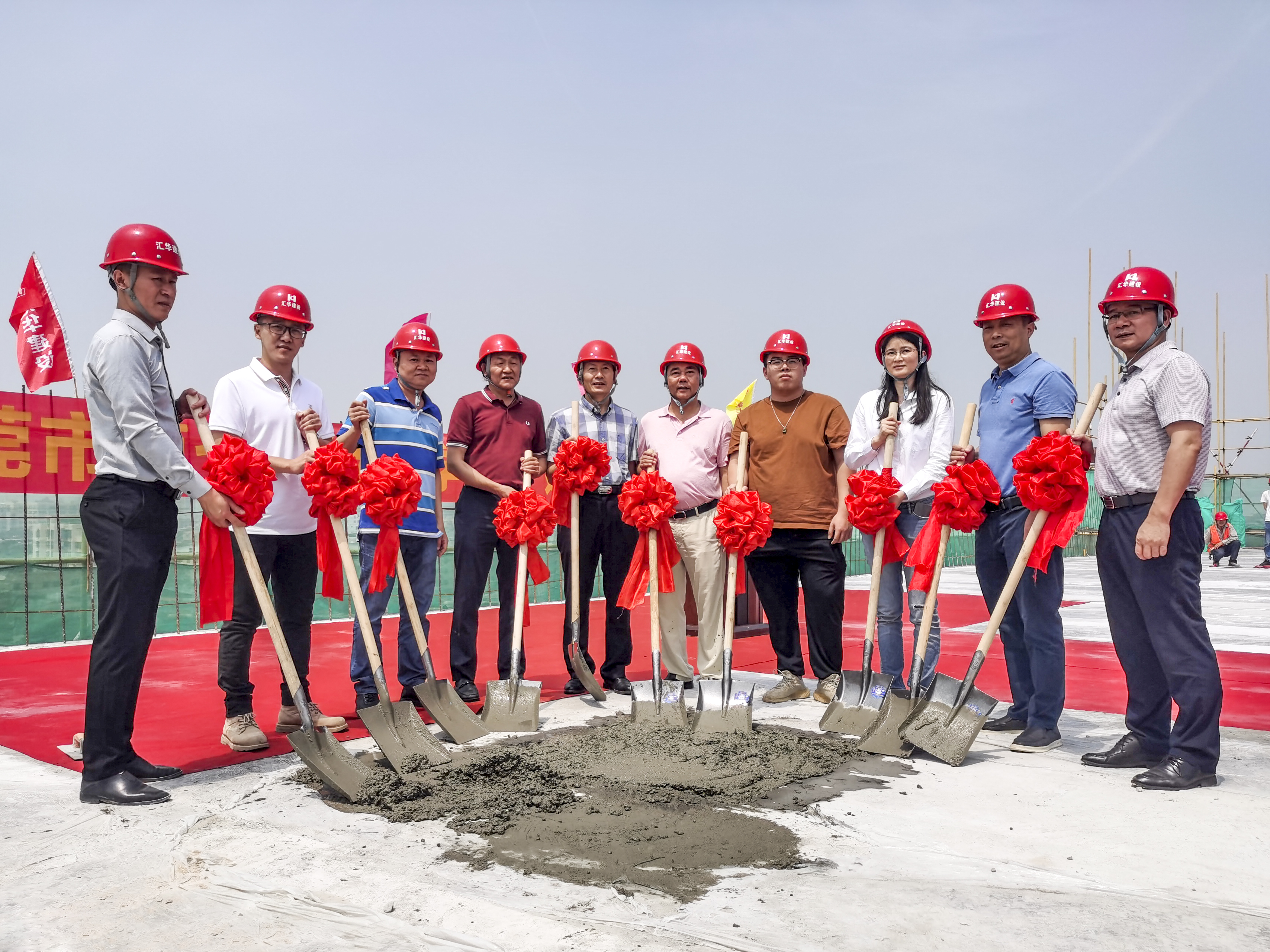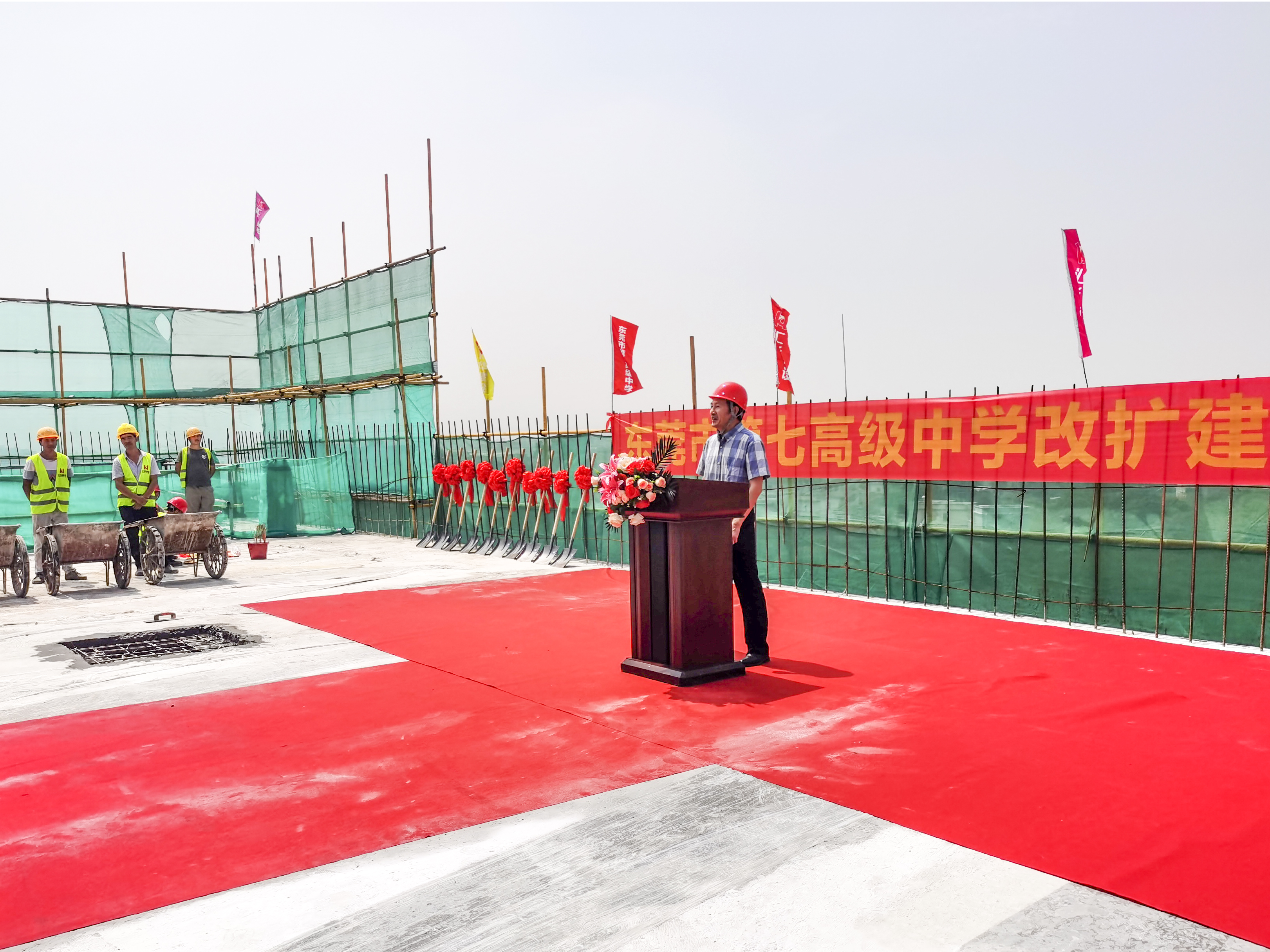 (封頂儀式現場) 東莞市城建局調研員馬文標先生、東莞市第七高級中學校長段文宏先生、廣東匯華建設集團有限公司董事長麥照華先生等領導先后致辭,隨后與廣東匯華建設集團有限公司副總經理廖志峰先生等領導一起出席封頂儀式。