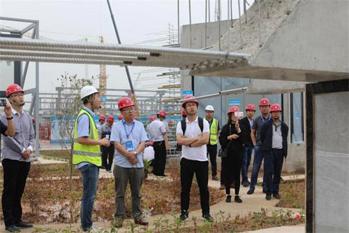 交流會上,項目技術總監楊曉毅分享了《基于BIM技術的特大型多方協作智慧建造管理》,對項目智慧工地驅動工程施工現場管理升級進行了成果展示交流。隨后,觀摩團隊乘坐大巴參觀了項目的主要施工區域,在項目管理人員的隨行講解下現場觀摩了世界領先的智慧工地、裝配式鋼結構建筑、安全文明標準化工地、先進工藝工法等,并通過現場二維碼掃碼查看項目施工現場、辦公生活區及配套設施等720°全景,體驗身臨其境的視野,全面深度了解項目建設。